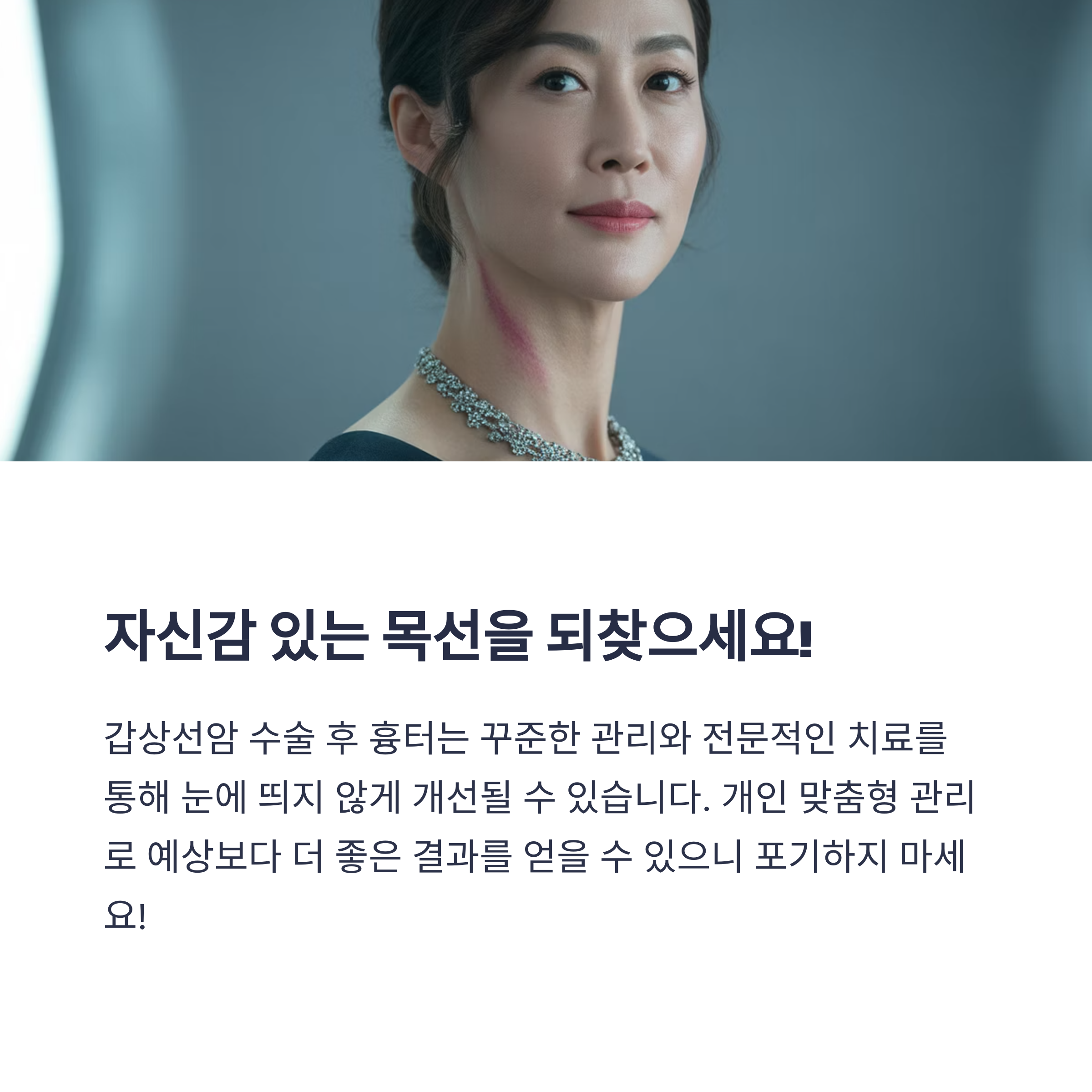갑상선암은 예후가 좋은 암으로 알려져 있지만, 수술 후 남는 목의 흉터는 많은 환자에게 심리적인 부담으로 다가옵니다. 목 앞쪽의 눈에 띄는 위치에 남는 선명한 수술 자국 때문에 불편함을 느끼거나 자신감을 잃는 경우도 적지 않죠. 하지만 다행히도, 꾸준한 관리와 적절한 치료를 병행하면 흉터를 최소화하고 예쁜 목선을 되찾을 수 있습니다.