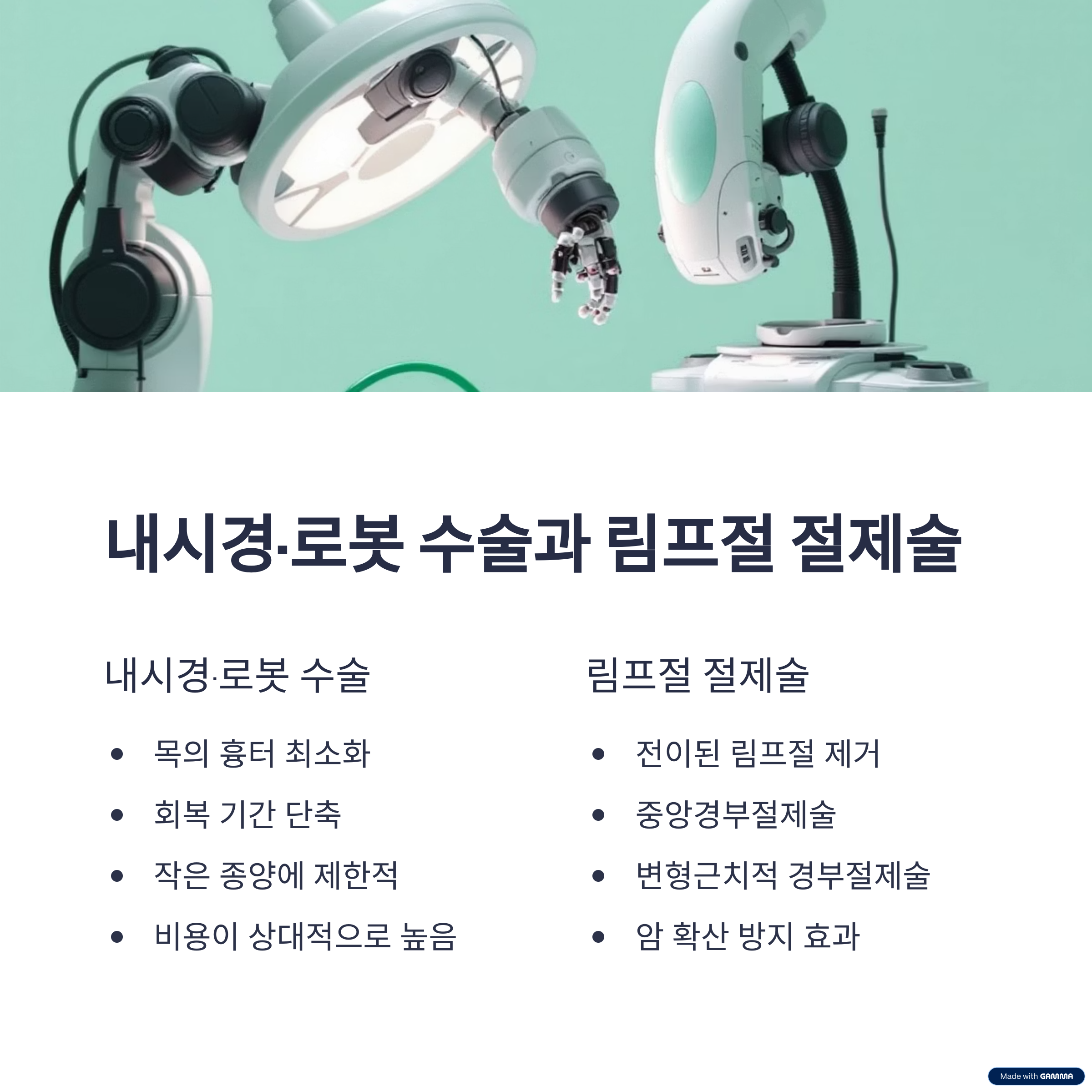 | 내시경/로봇 수술 | 미용적 이유, 작은 암 | 흉터 적음, 회복 빠름 | 비용 높음, 제한적 적응증 |