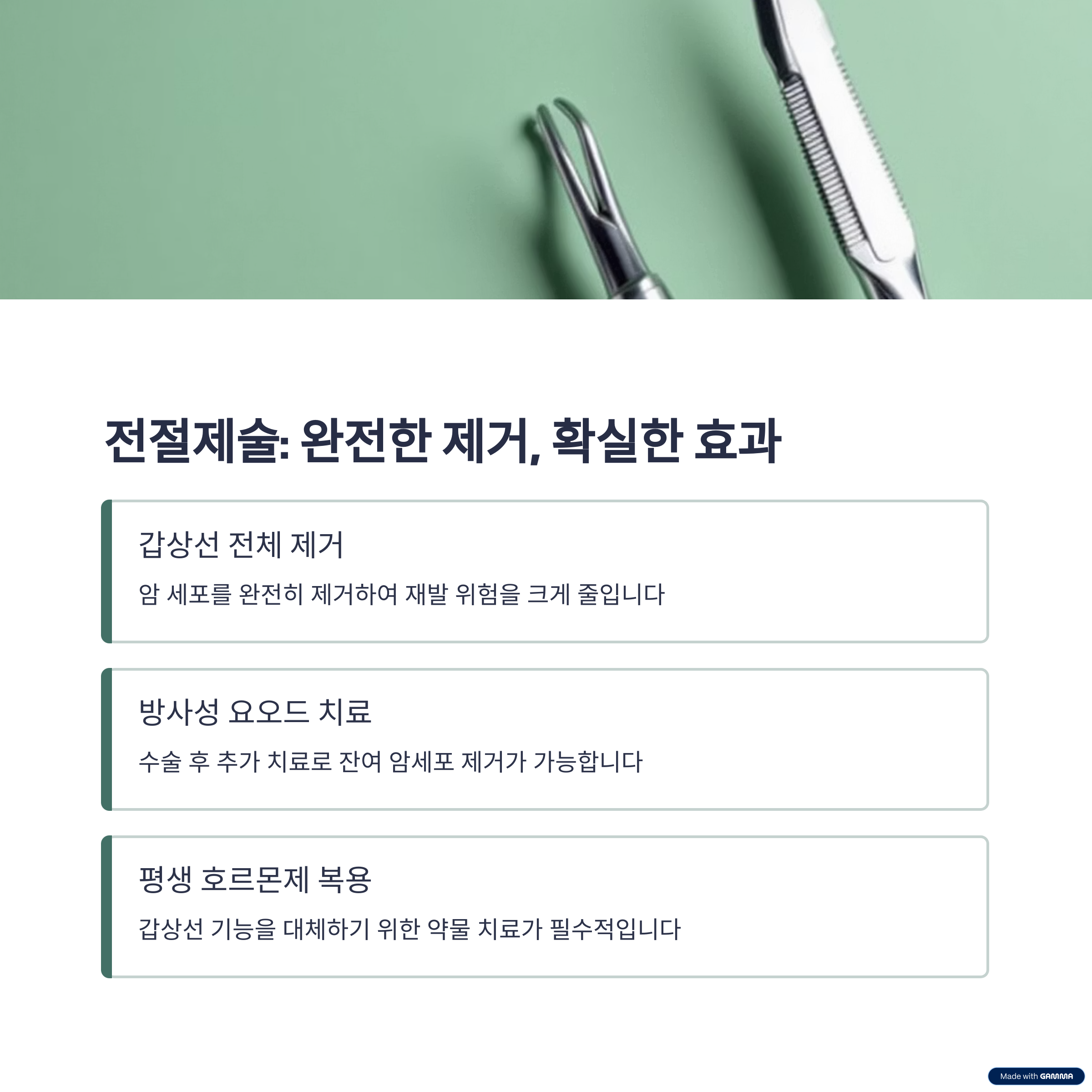 | 전절제술 | 큰 암, 양측성, 전이 있음 | 암 완전 제거 가능, 요오드 치료 용이 | 평생 호르몬제 필요, 합병증 위험 |