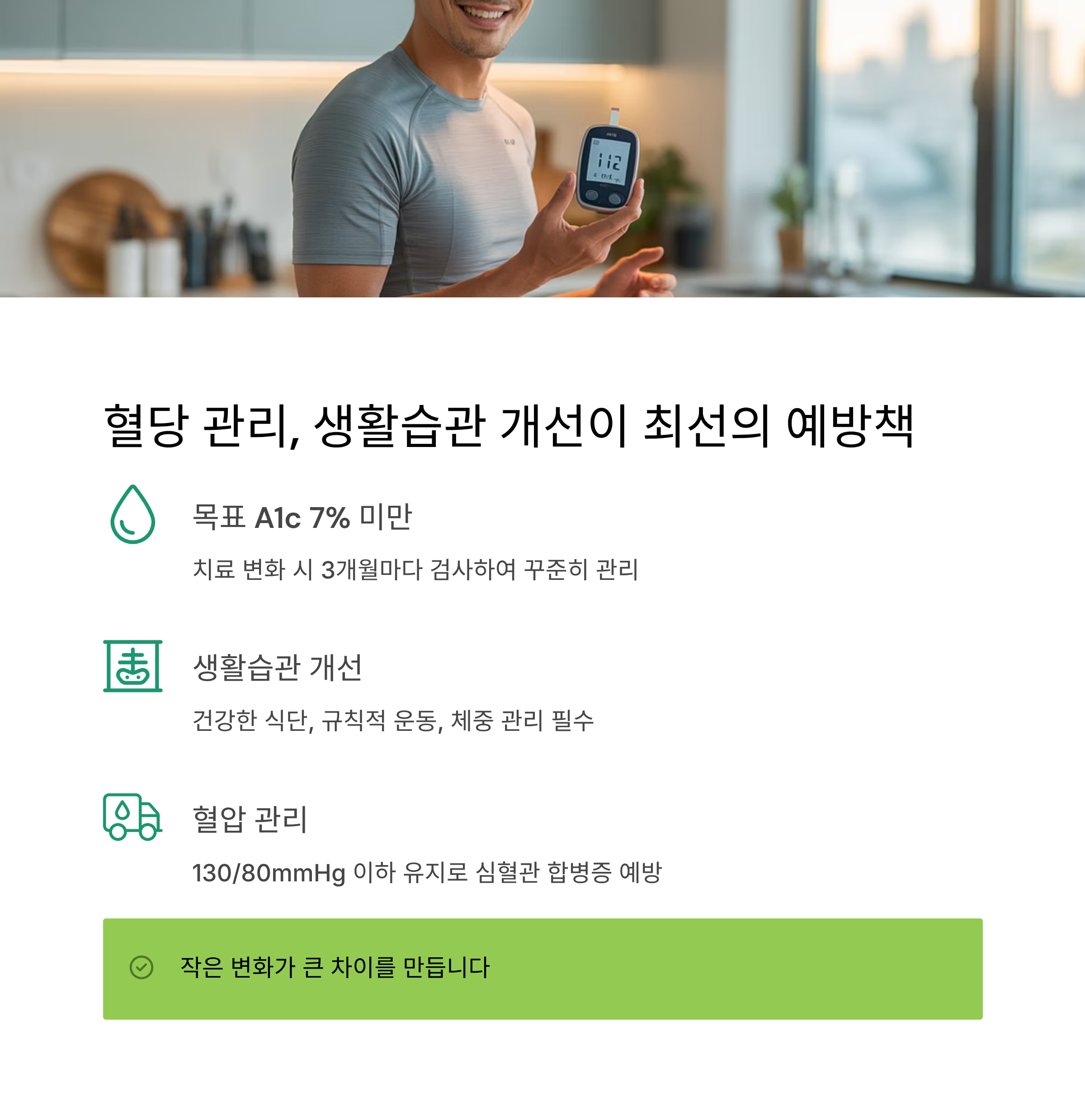 합병증 예방의 첫걸음은 혈당 조절입니다. 목표 수치를 지키는 것이 중요합니다.