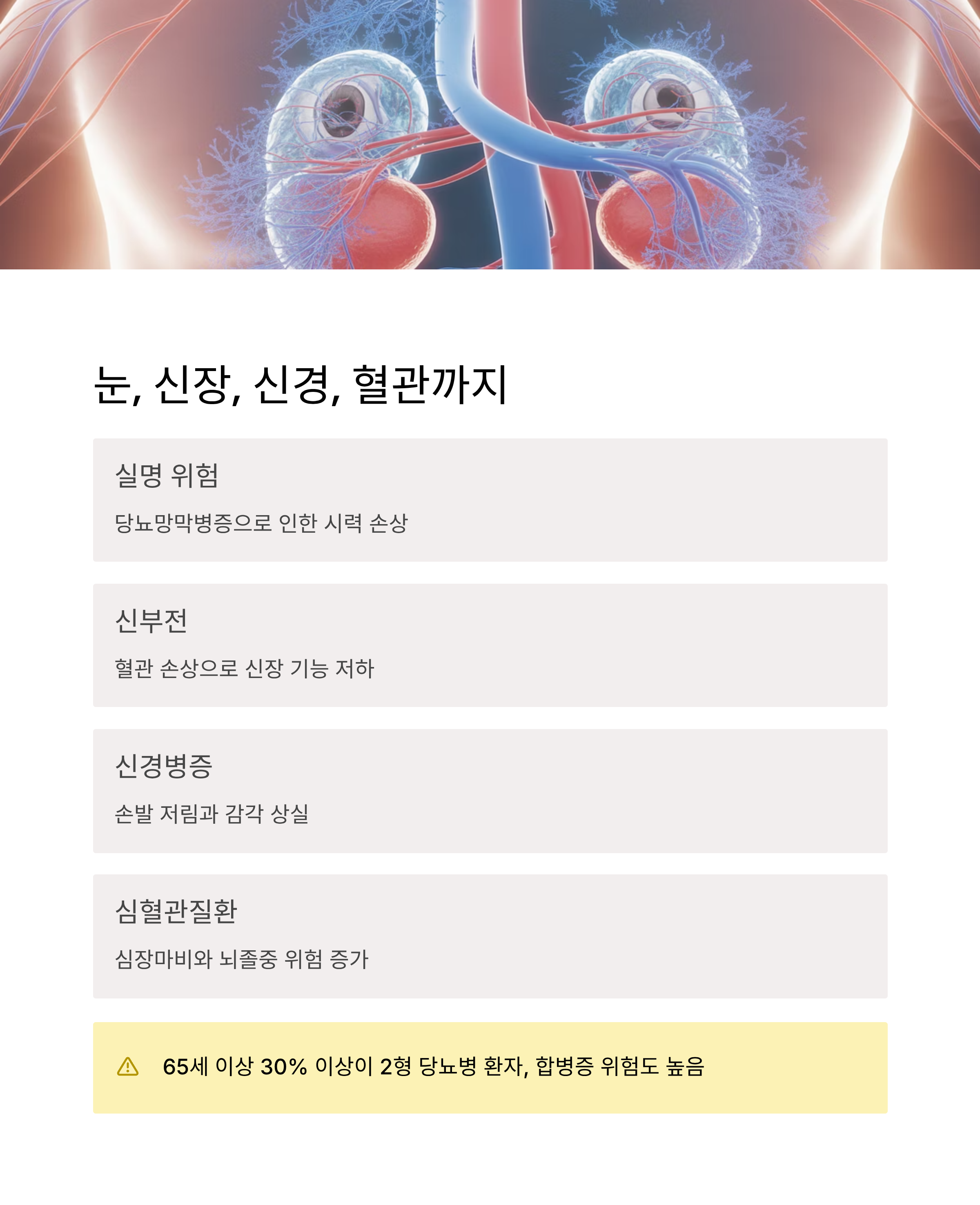 당뇨는 단순히 혈당만 높은 질환이 아닙니다. 장기간 관리가 잘 되지 않으면 눈, 신장, 신경, 혈관 등 전신에 영향을 미치며, 심근경색이나 뇌졸중 같은 치명적인 질환으로 이어질 수 있습니다.