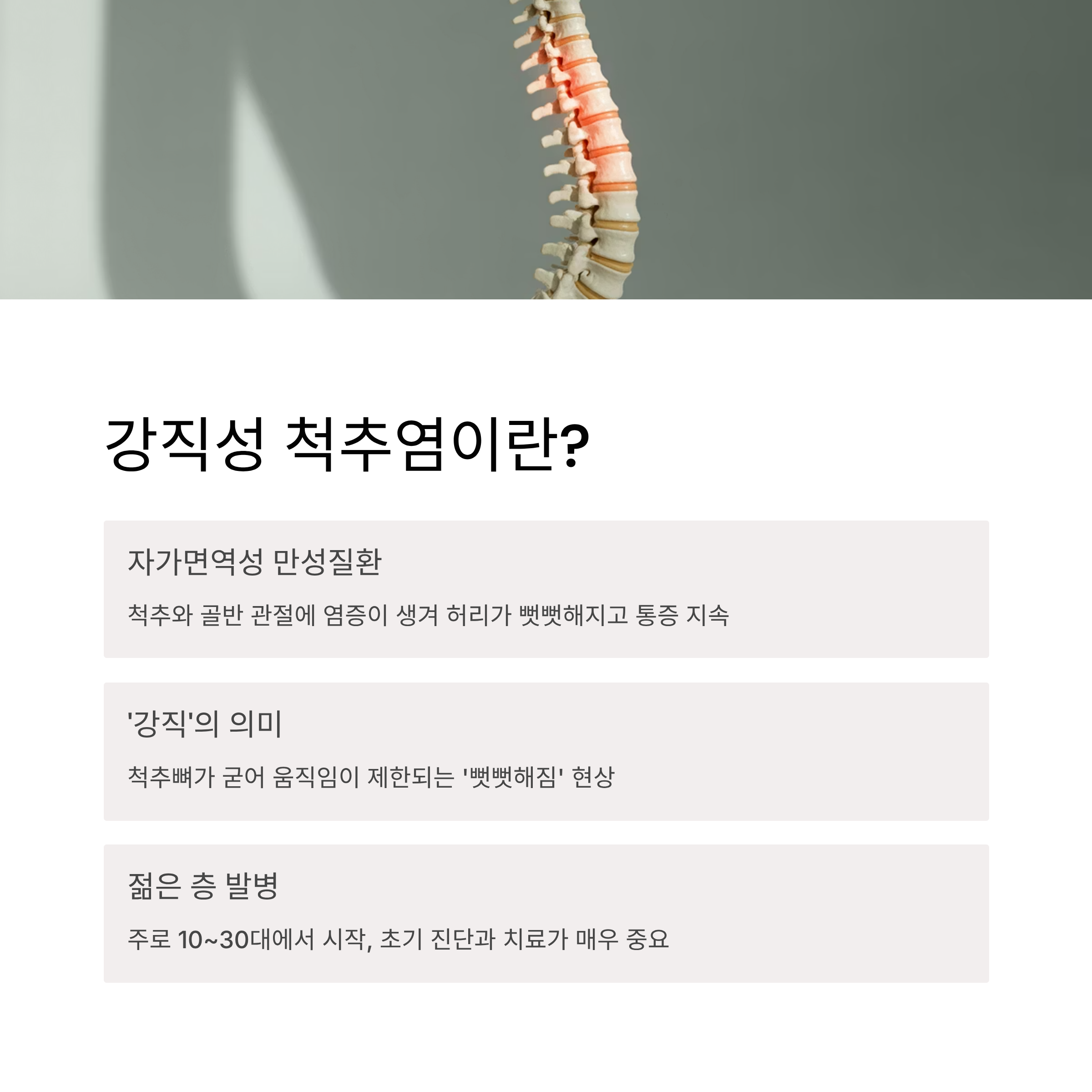 강직성 척추염은 젊은 나이에 시작해 평생 영향을 미칠 수 있는 질환입니다. 그러나 조기 발견과 꾸준한 치료를 통해 척추 강직을 늦추고 삶의 질을 유지할 수 있습니다.