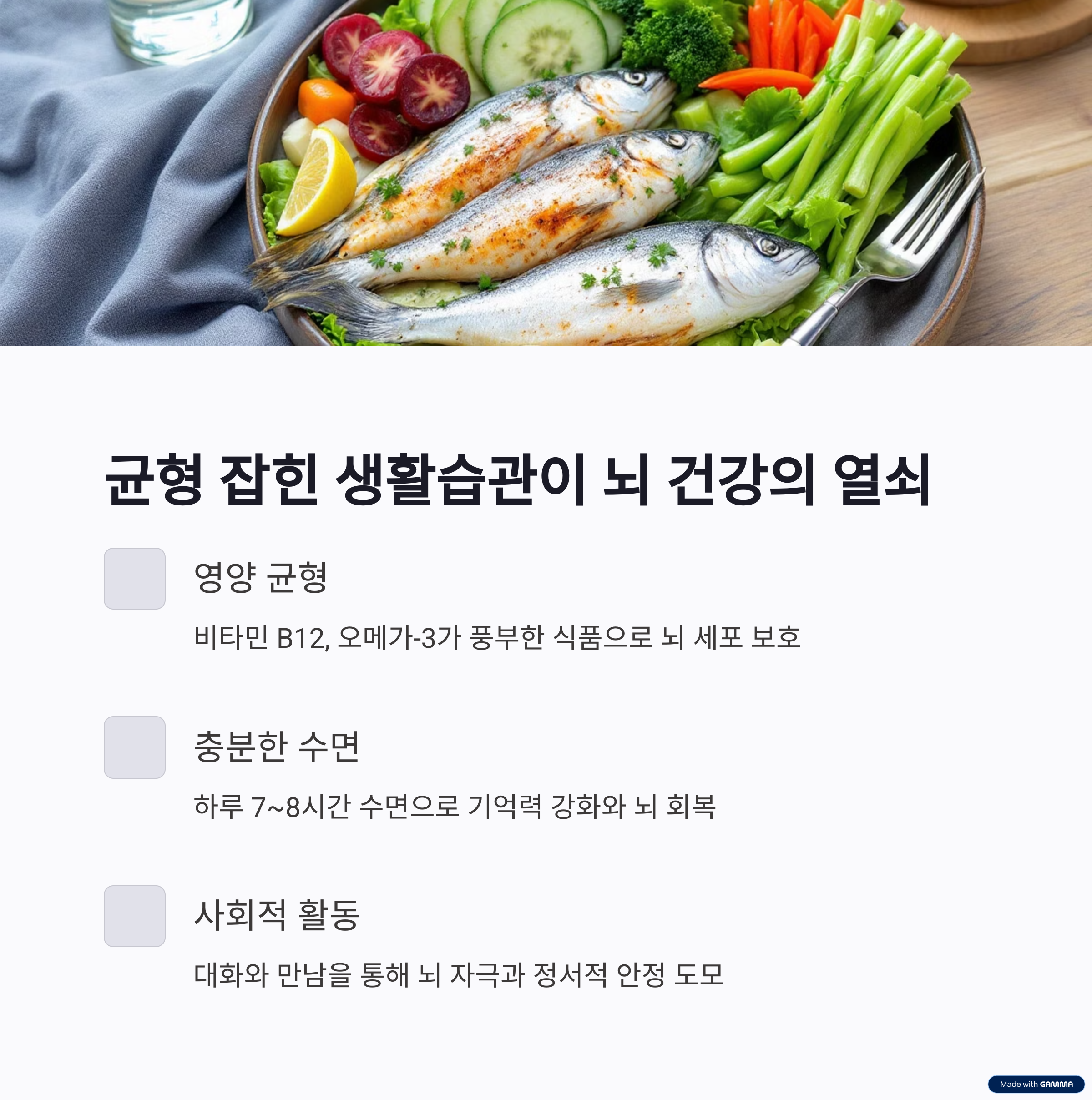 - 균형 잡힌 식사, 충분한 수면, 사회적 활동, 유산소 운동도 함께 하면 효과가 높습니다.