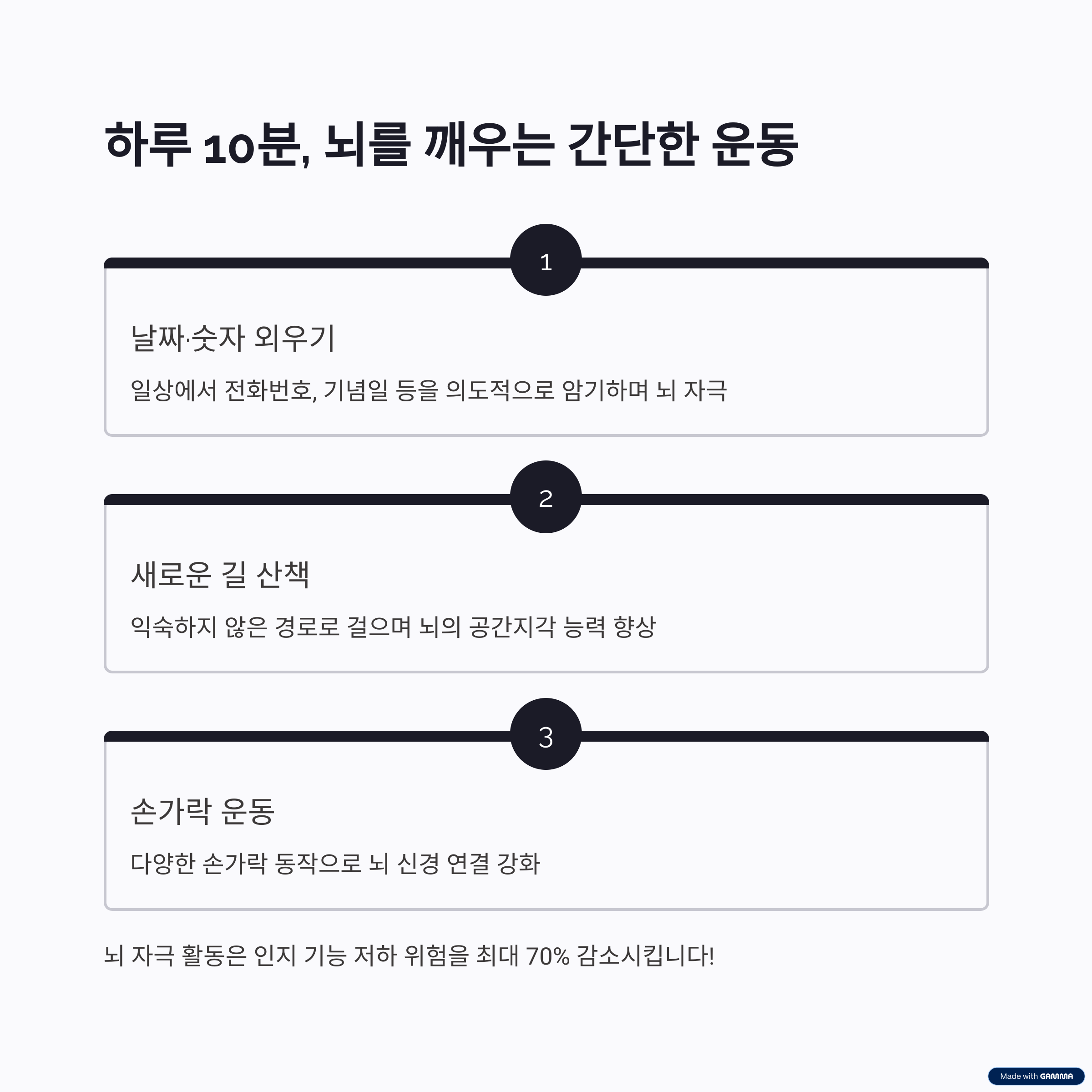 - 기억력 훈련, 암산, 글쓰기, 산책, 손가락 운동 등 간단한 뇌운동을 매일 실천하세요.
