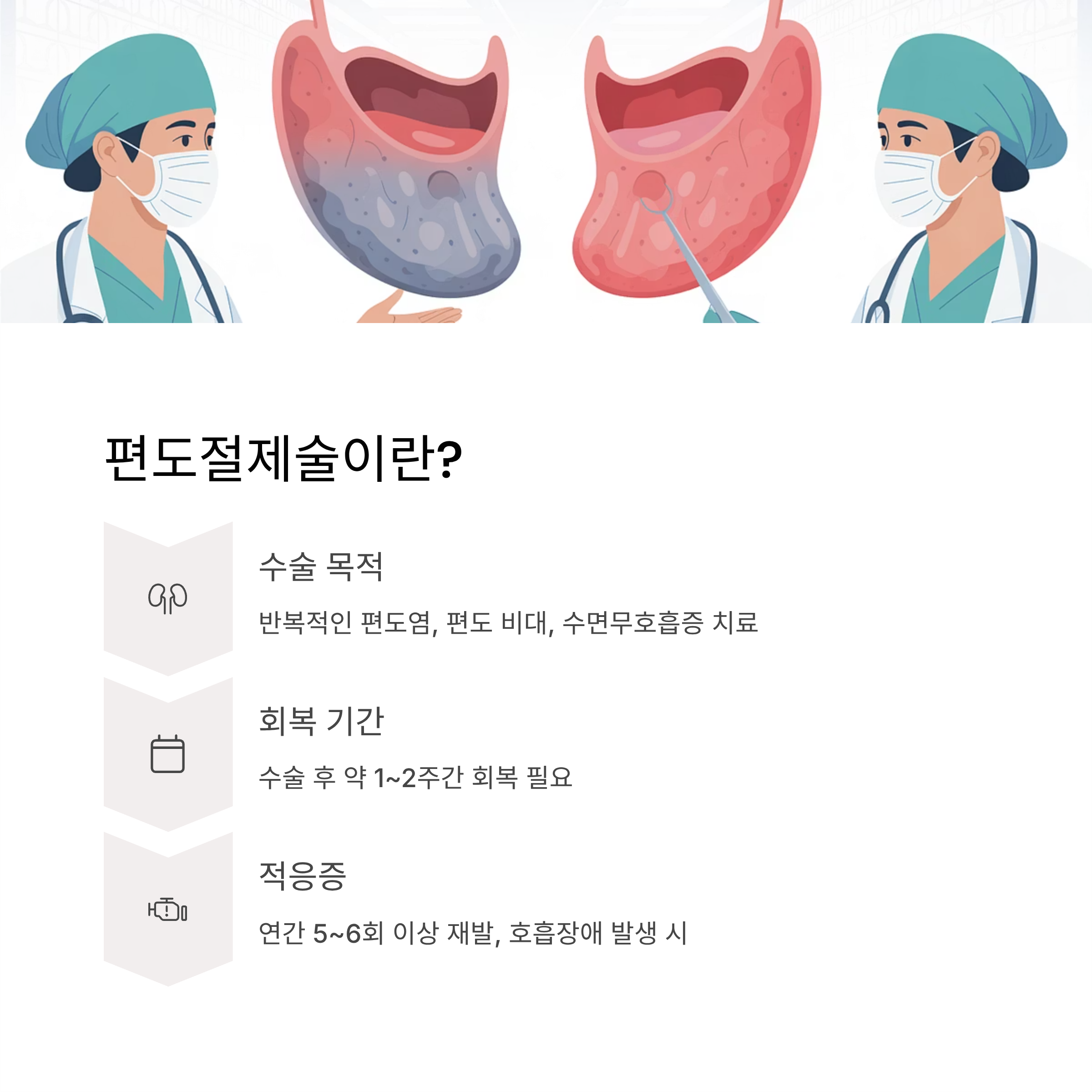 - 연 3~5회 이상 편도염 반복 : 매년 반복적인 염증으로 일상생활 지장이 큰 경우