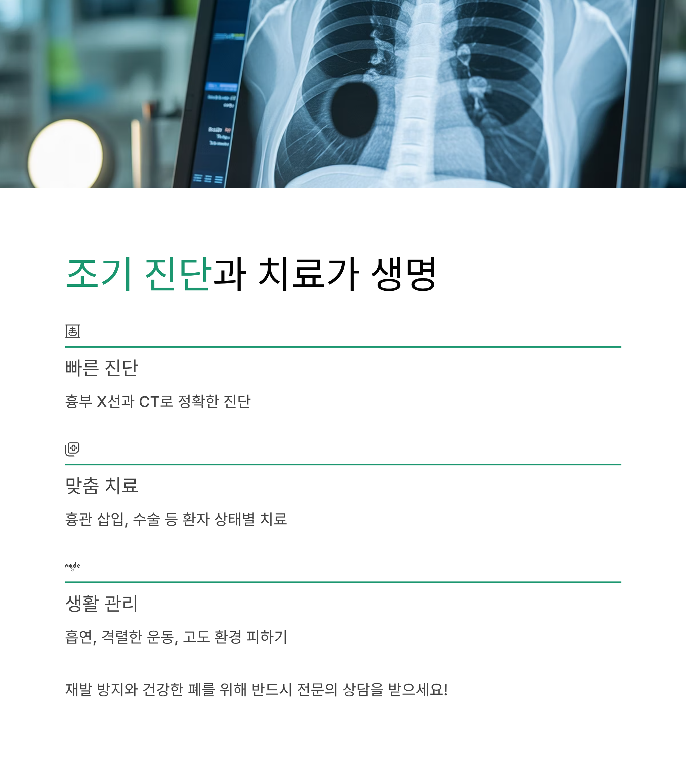 폐기흉은 조기 진단과 치료, 그리고 생활 습관 관리가 핵심입니다. 특히 흡연자는 반드시 금연을 고려해야 하며, 기침이나 흉통이 반복된다면 방치하지 말고 전문 진료를 받아야 합니다.