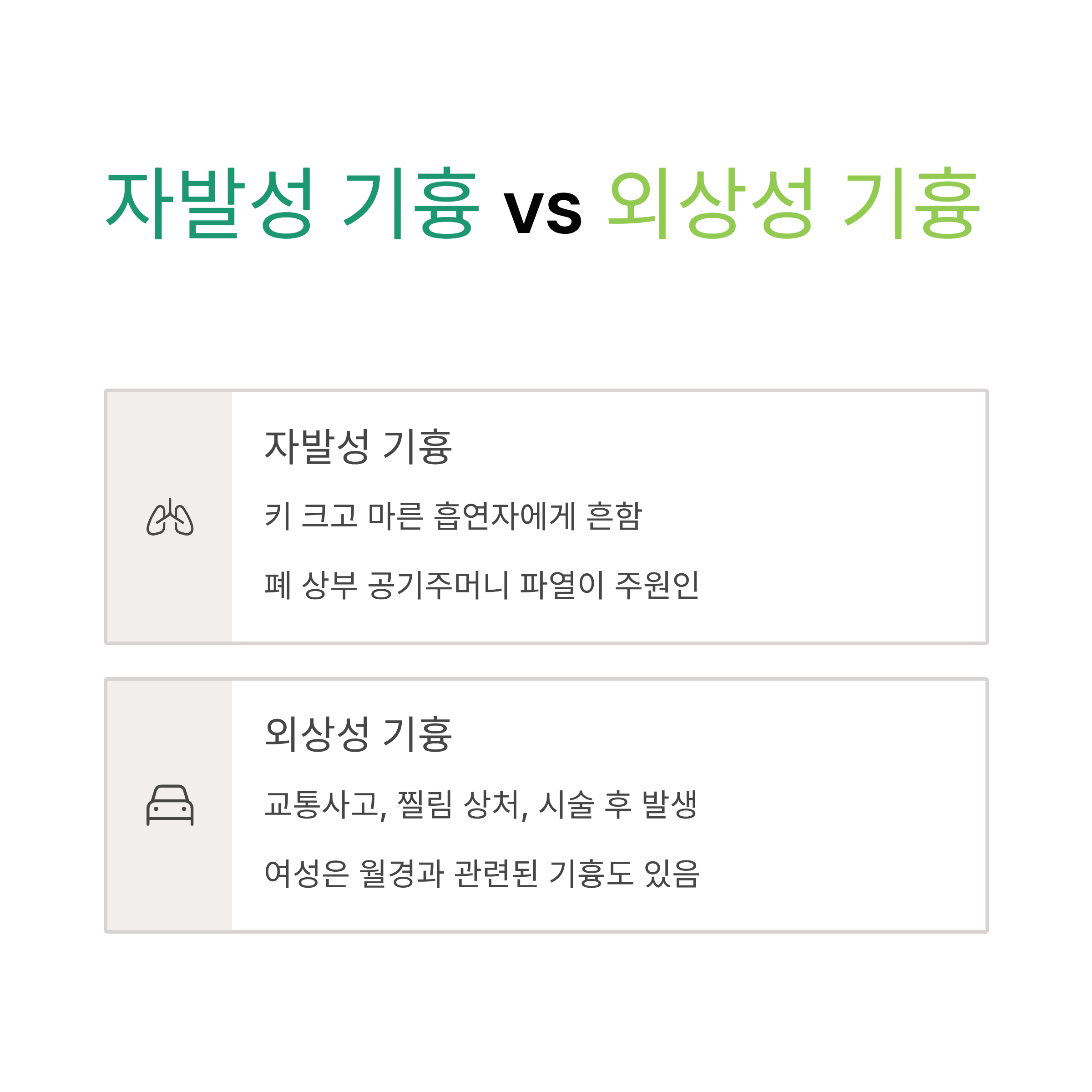| 발생 원인 | 폐기포 파열 등 내부 요인 | 외부 외상이나 시술 |