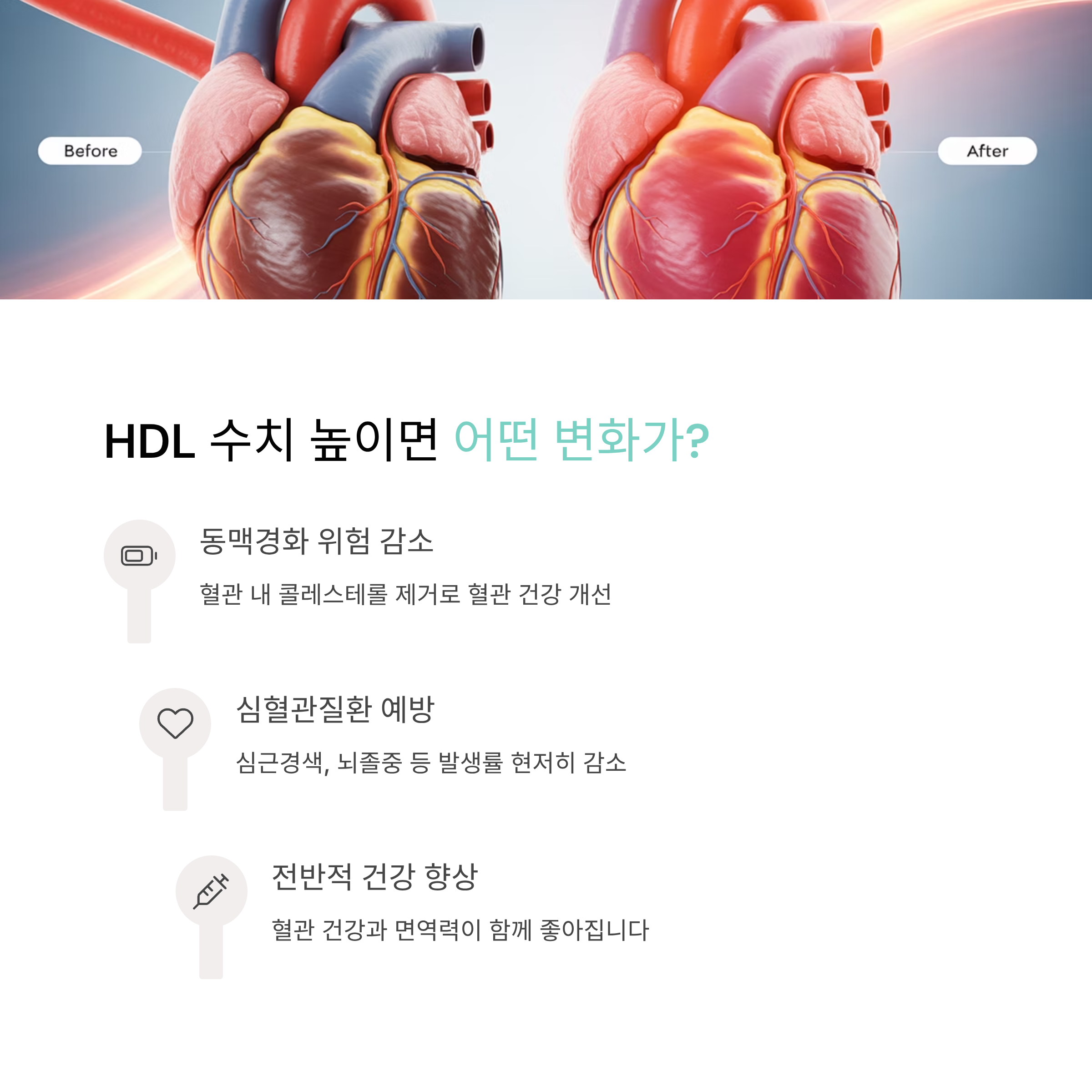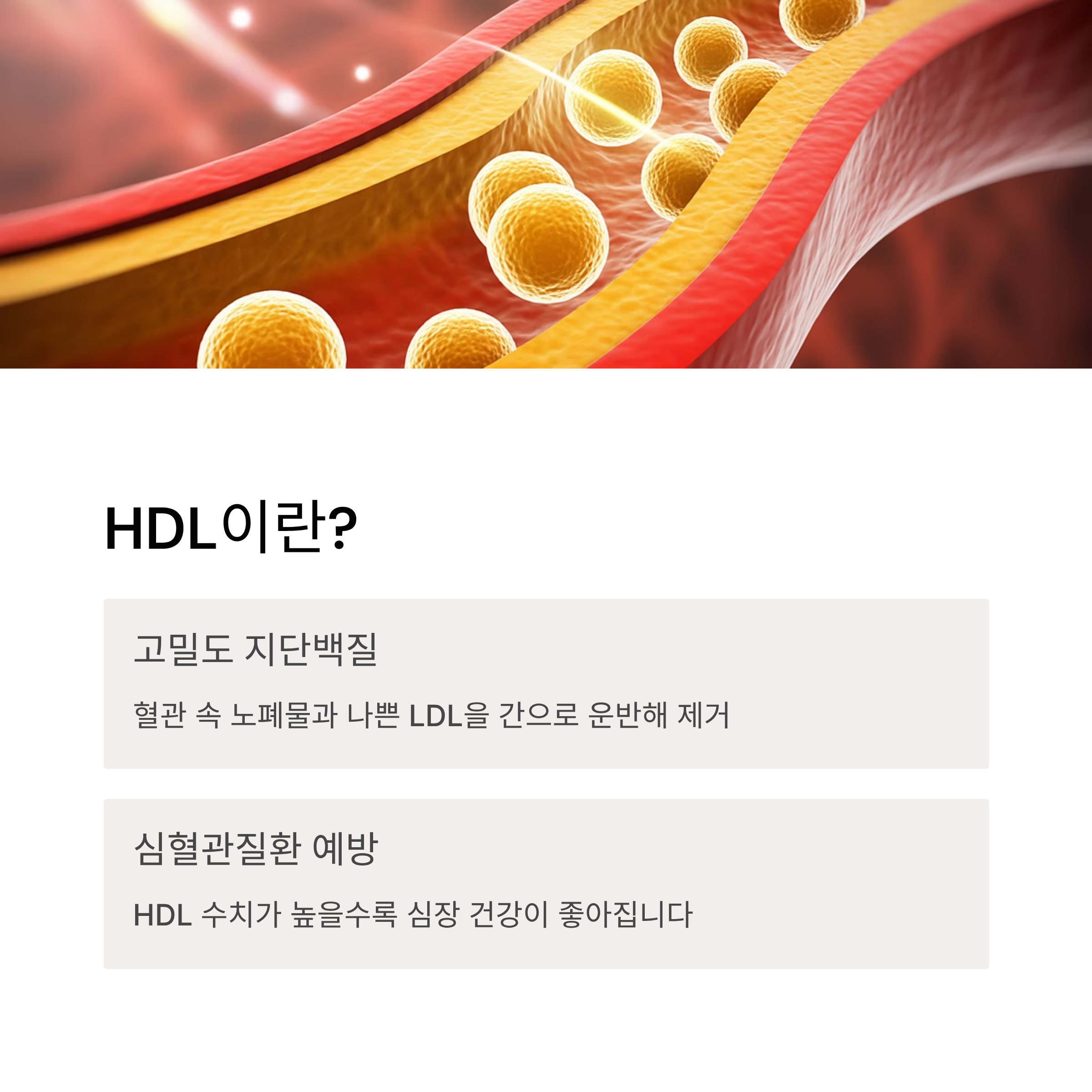 따라서, 건강을 지키려면 단순히 콜레스테롤을 줄이는 것이 아니라 HDL 수치를 높이고 LDL 수치를 낮추는 것이 핵심입니다.
