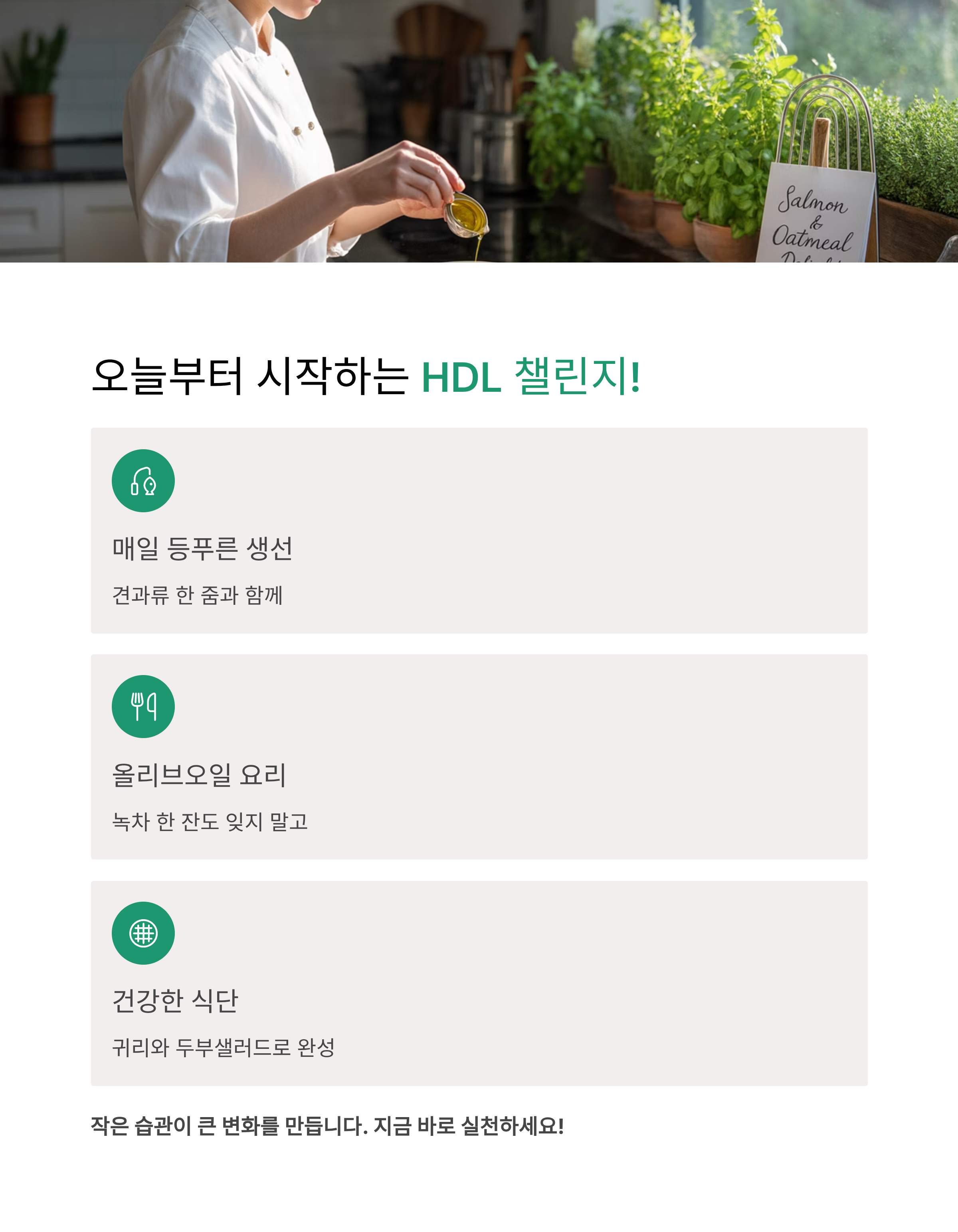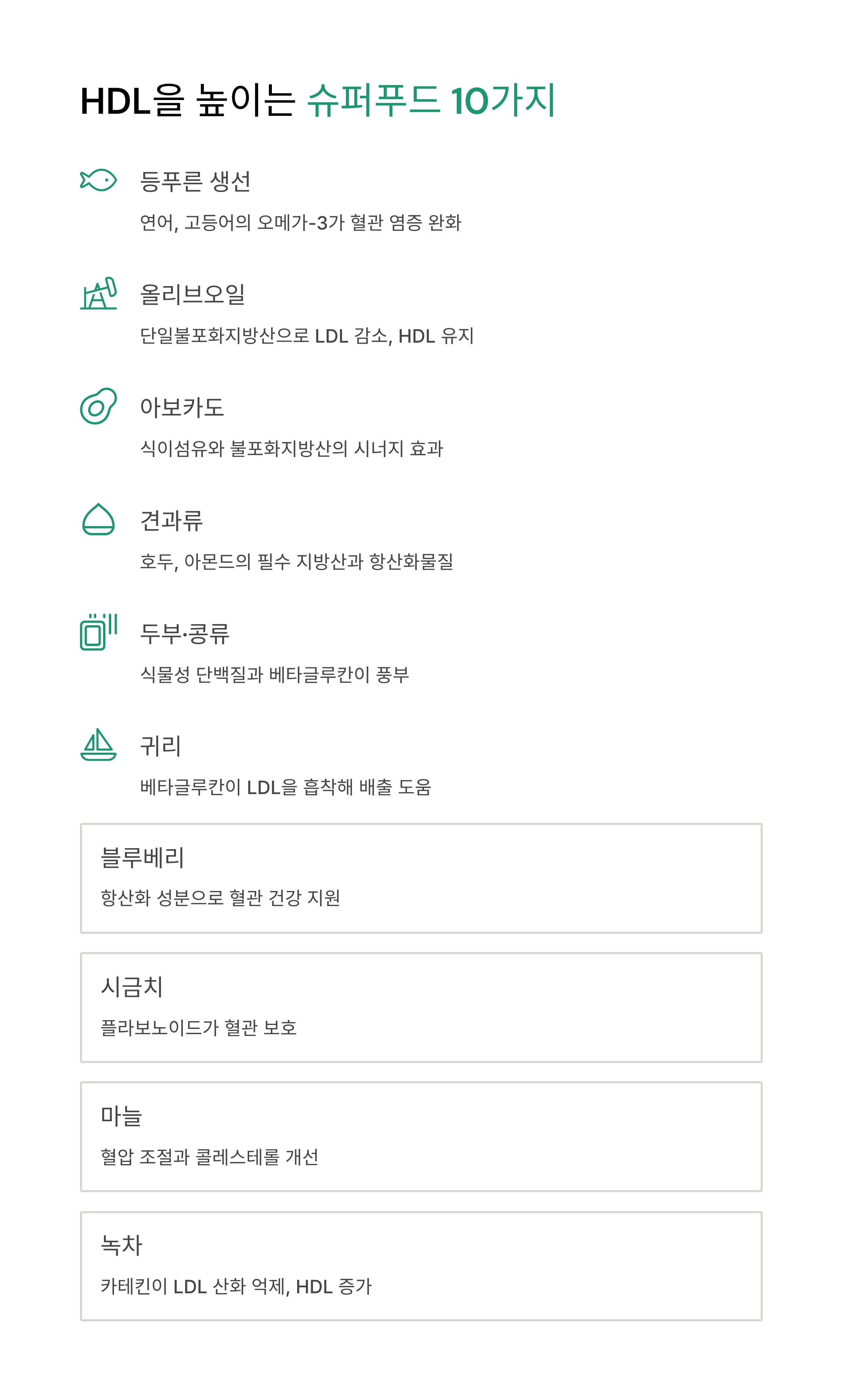 이처럼 하루 식단에 간단히 포함하는 것만으로도 HDL 수치를 높이고 혈관 건강을 지킬 수 있습니다.