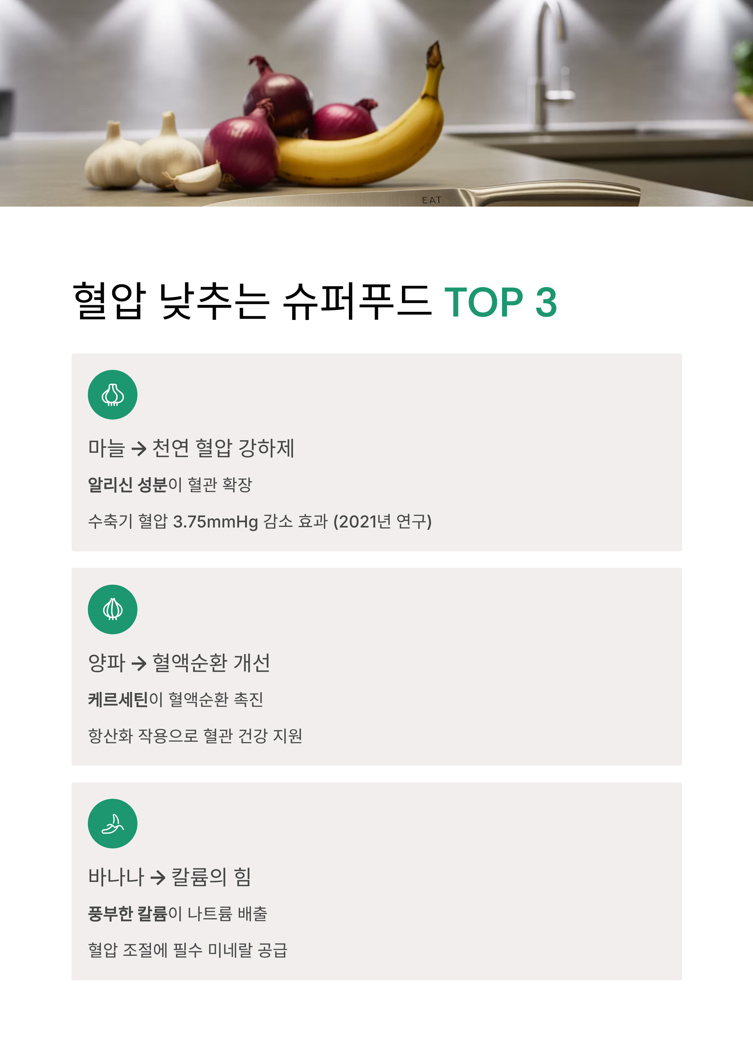 혈압은 조용한 살인자라 불릴 만큼 관리가 중요합니다. 약에만 의존하기보다는 혈압 낮추는 슈퍼푸드를 일상 식단에 적극적으로 활용하면 자연스럽게 혈압을 조절하고 건강을 지킬 수 있습니다. 오늘 소개한 마늘, 양파, 바나나, 브로콜리, 연어, 귀리, 다크초콜릿을 식단에 균형 있게 포함시켜 건강한 생활을 시작해보세요.