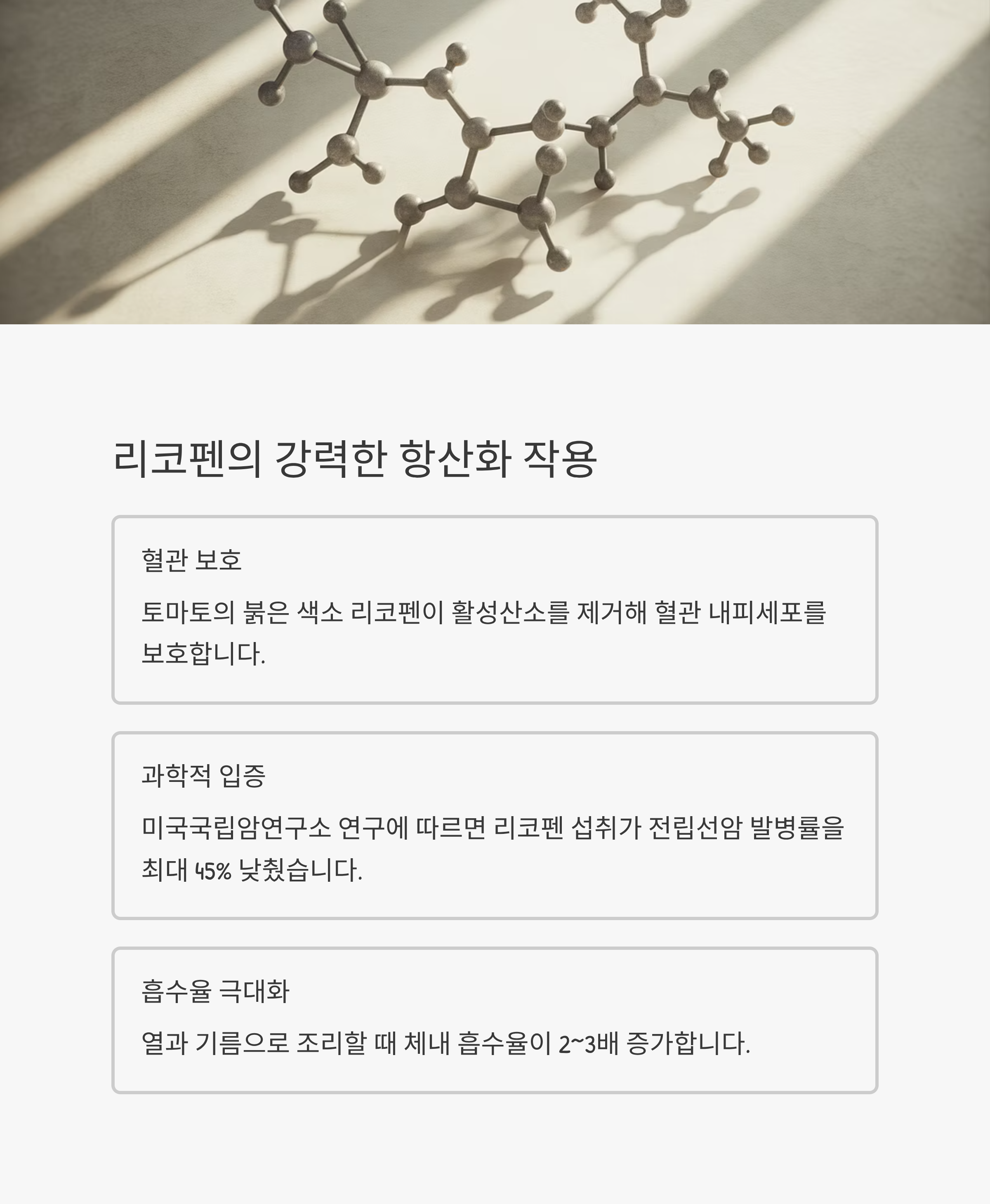 TIP. 리코펜은 가열과 지방(올리브오일)과 함께할 때 흡수율이 크게 올라갑니다. 생으로만 먹지 말고, 저염 토마토소스나 토마토 스튜도 활용하세요.