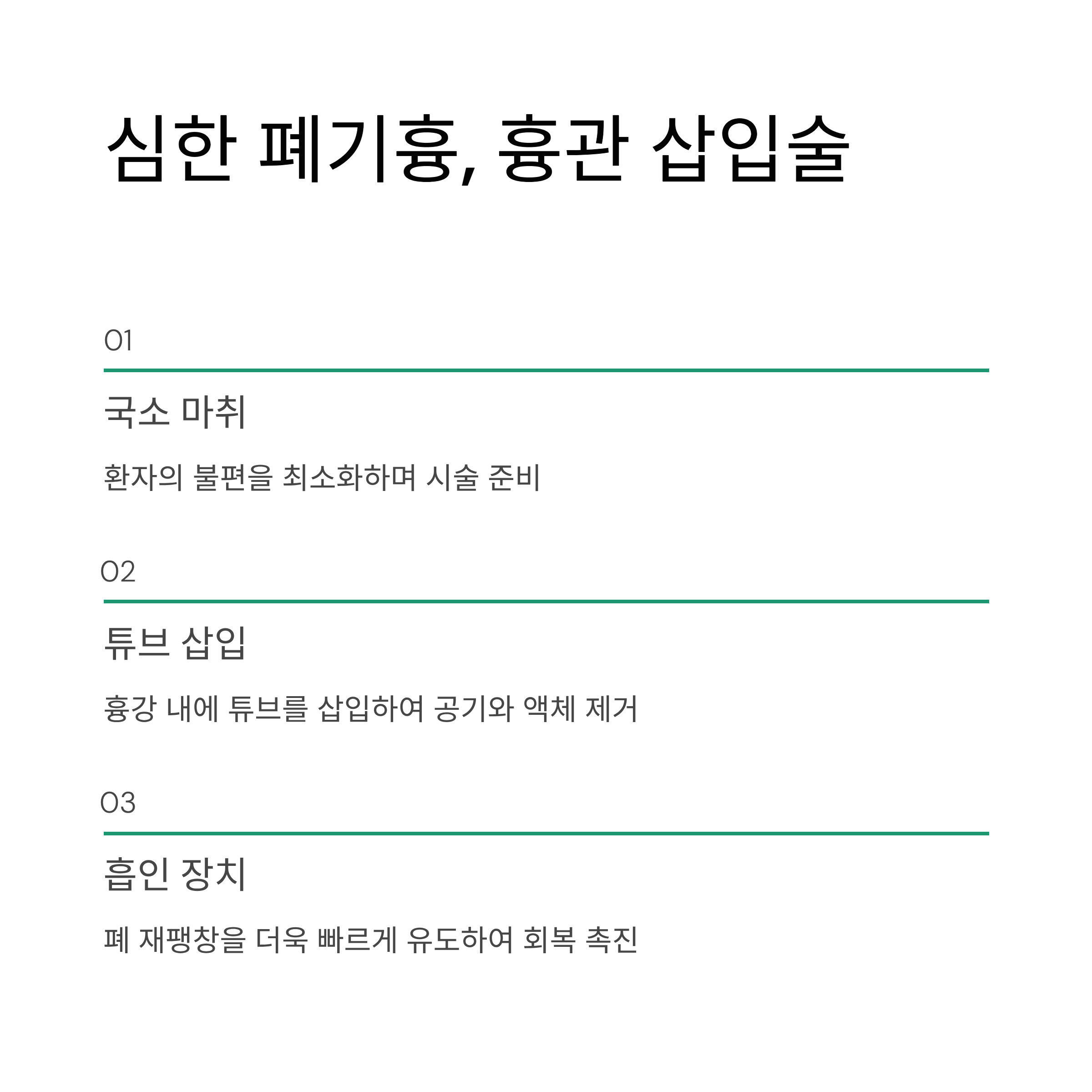 - 필요할 경우 흉막 일부를 절제하여 재발을 방지합니다.