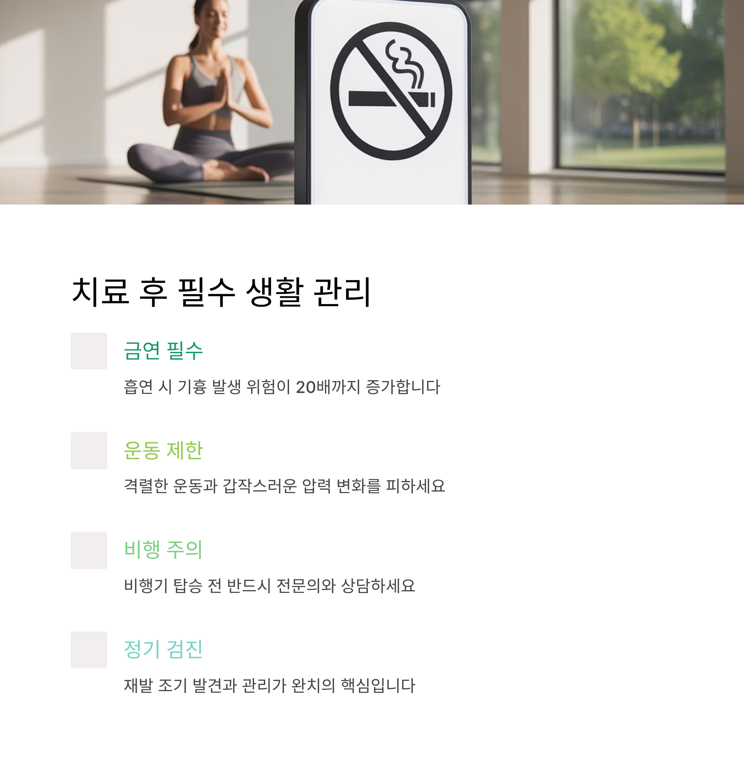 폐기흉 치료가 끝났다고 해서 안심해서는 안 됩니다. 재발 가능성이 높기 때문에 생활 습관 관리와 정기검진이 필수입니다.