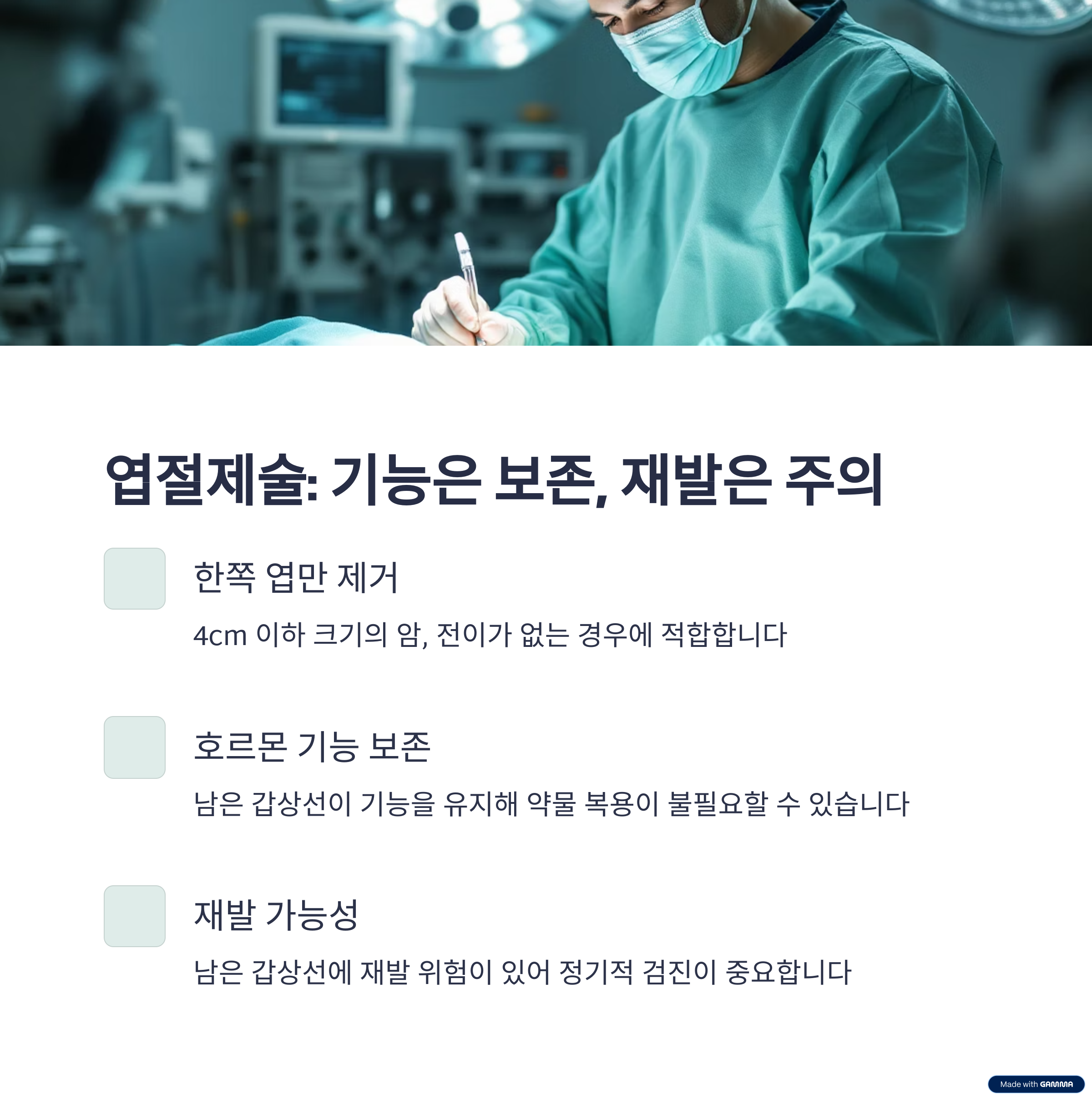 | 엽절제술 | 작고 한쪽에 국한된 암 | 호르몬 보존 가능, 합병증 적음 | 암 잔존 위험, 추가 수술 가능성 |