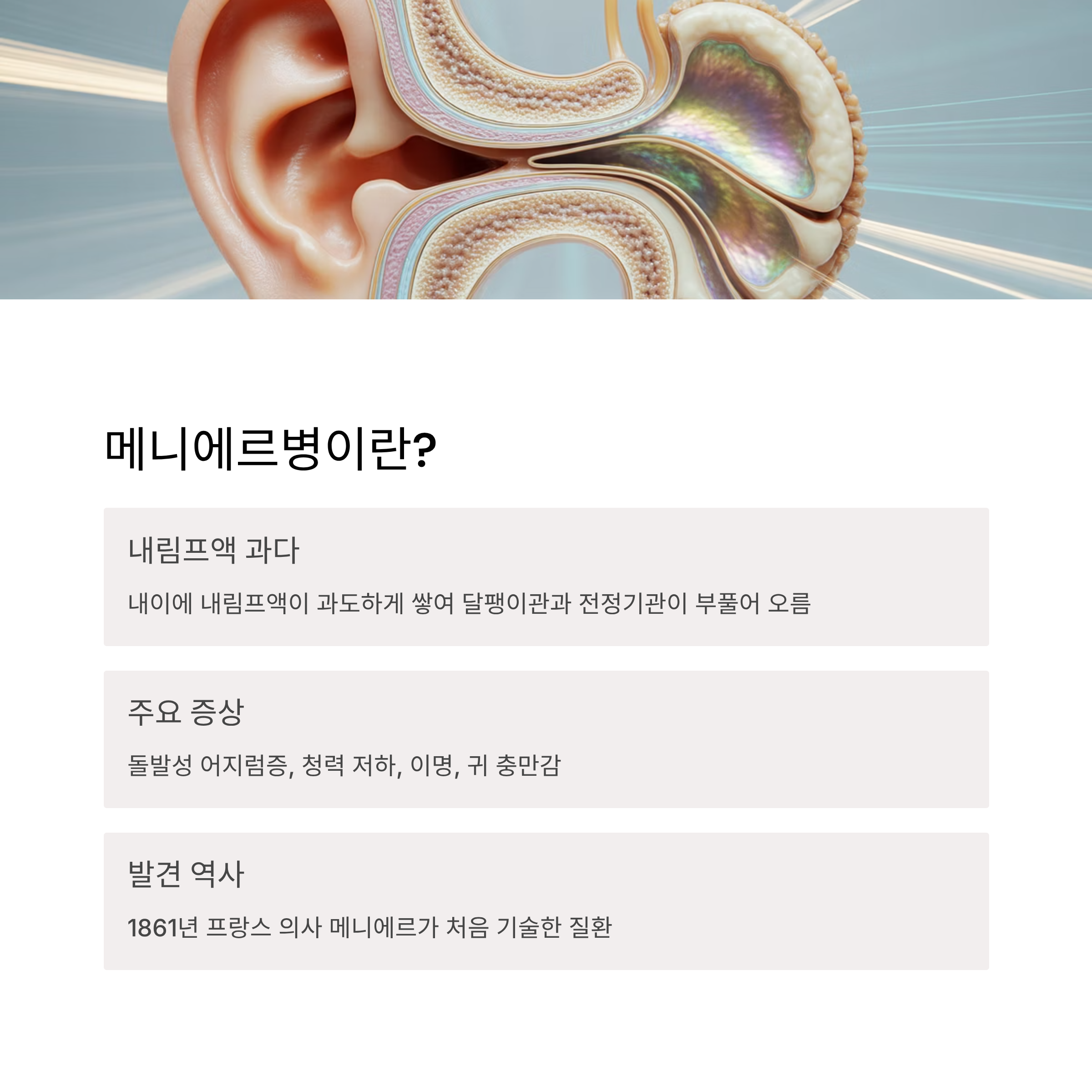 메니에르병은 내이(內耳)의 내림프액(Endolymph)이 비정상적으로 증가하여 발생하는 만성 귀 질환입니다. 내림프액 압력이 높아지면 평형감각과 청각을 담당하는 전정기관과 와우가 영향을 받아 현기증, 청력 저하, 이명, 귀먹먹함이 반복적으로 나타납니다.