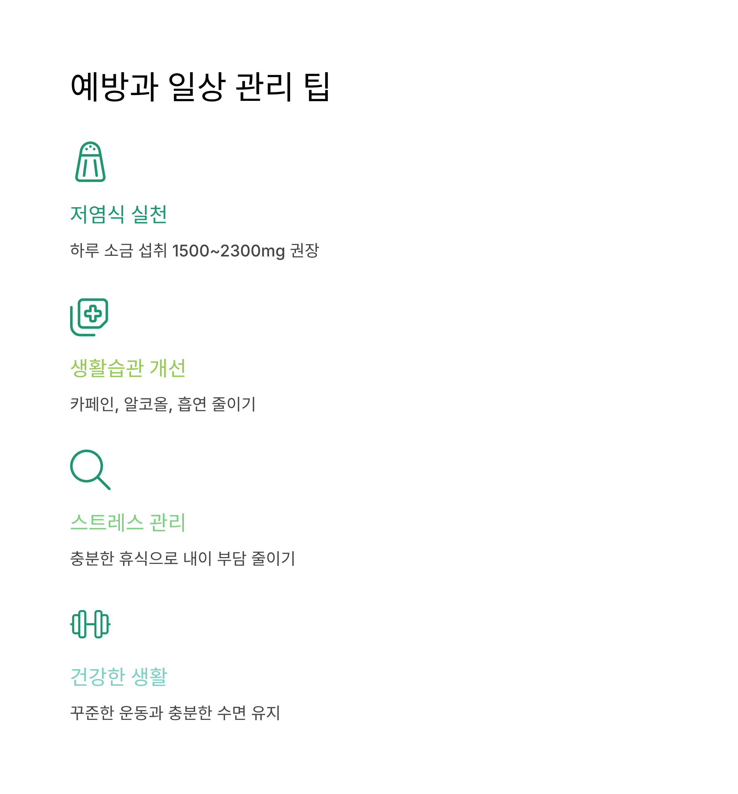 - 생활습관 개선: 저염식, 스트레스 관리, 규칙적 수면
