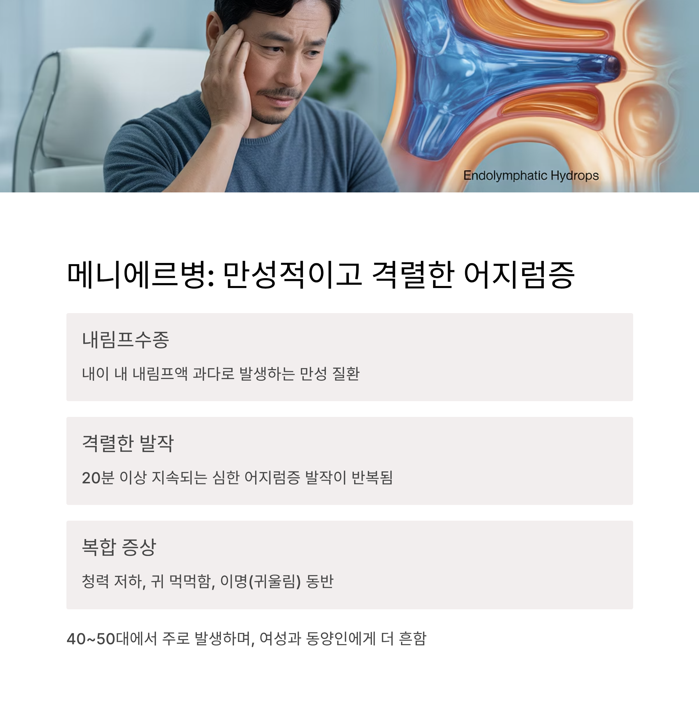 메니에르병은 내이 속 내림프액이 과도하게 쌓여(내림프 수종) 압력이 높아지면서 발생하는 만성 질환입니다. 평형감각과 청각을 동시에 침범하여 어지럼증과 청력 저하가 함께 나타납니다.