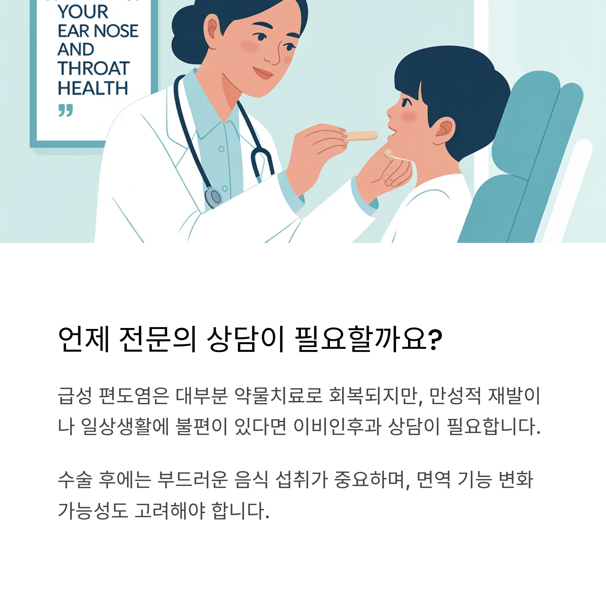무조건 수술이 좋은 것은 아닙니다. 그러나 반복되는 통증과 불편함이 삶의 질을 떨어뜨린다면, 편도절제술은 매우 효과적인 치료 방법이 될 수 있습니다.