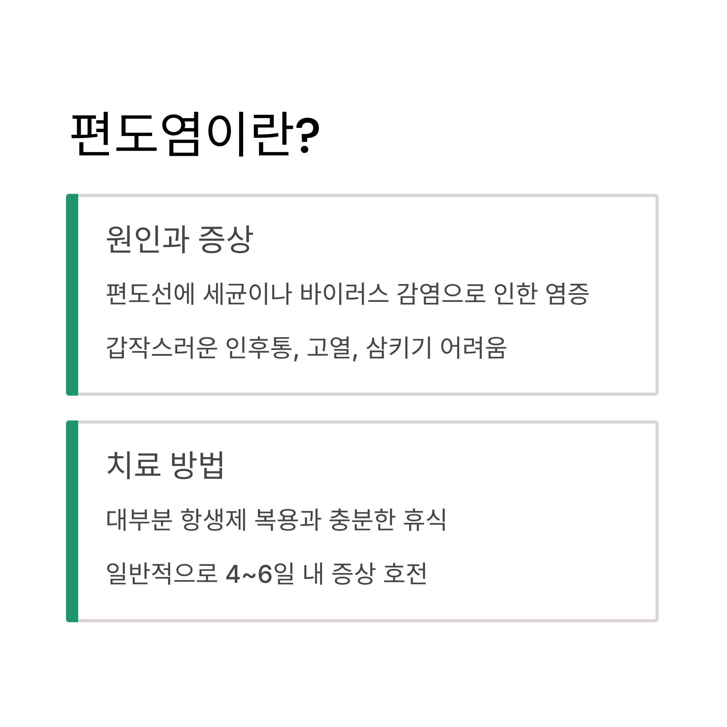 편도염(Tonsillitis)은 입 안 양쪽에 위치한 편도선(tonsils)에 염증이 생긴 질환입니다. 편도는 체내로 들어오는 세균과 바이러스를 막아주는 면역 기능을 가진 조직이지만, 오히려 이들이 편도에 감염되면서 염증을 일으킬 수 있습니다.