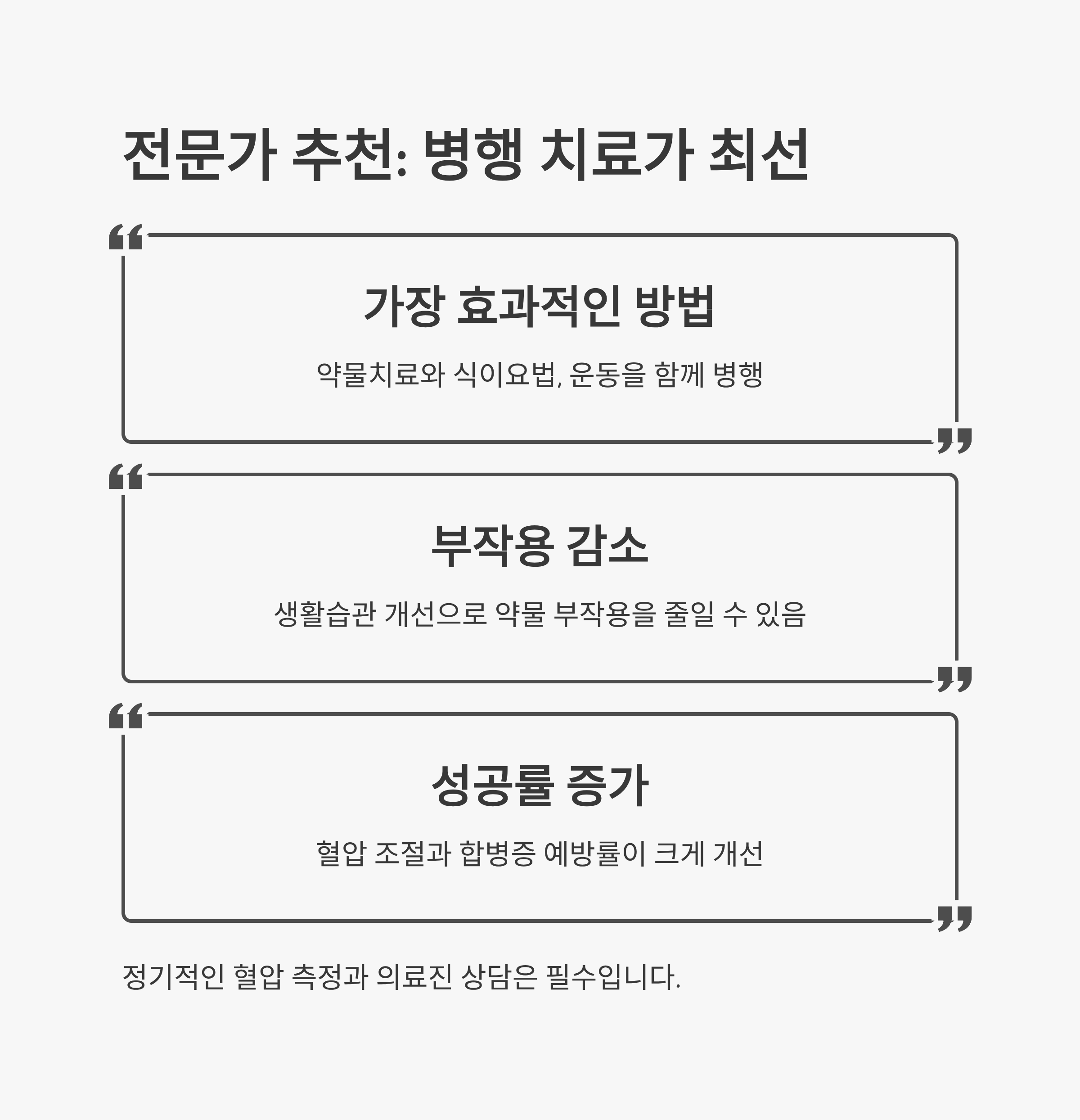 의사들은 보통 약물치료 + 식이요법 병행을 권장합니다. 특히 고혈압 2기 이상 환자라면 약물치료가 필요하며, 초기나 경계 단계 환자는 음식과 생활습관 개선만으로도 혈압을 충분히 조절할 수 있습니다.
