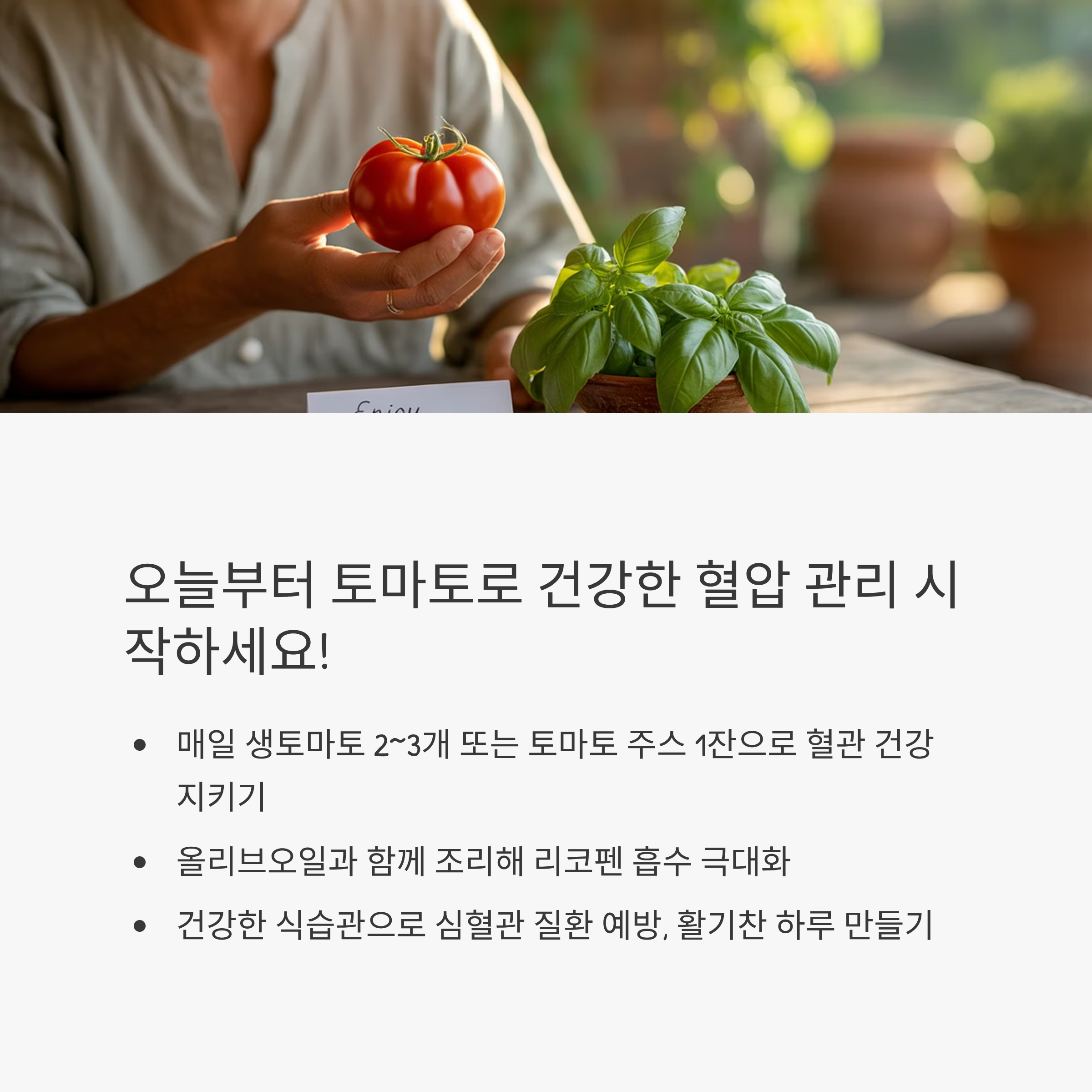 리코펜과 칼륨, 그리고 항산화 성분까지 — 토마토가 혈압을 낮추는 과학적 기전과 하루 권장량, 저염 레시피, 주의사항을 한 번에 정리했습니다.
